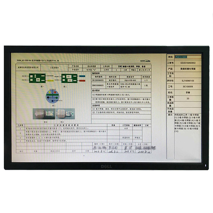 液晶電子看板,采用高分辨率,顯示內容豐富,色彩和布局可根據客戶喜好進行設計,同時可通過以太網/無線網絡將工廠內的所有電子看板進行集中管理,并且將實時的生產數據上傳到服務器,管理人員在辦公室就可以實時查看生產進度,返修率等數據。